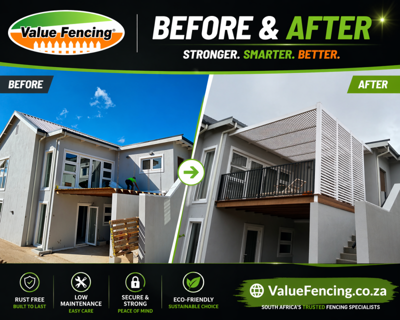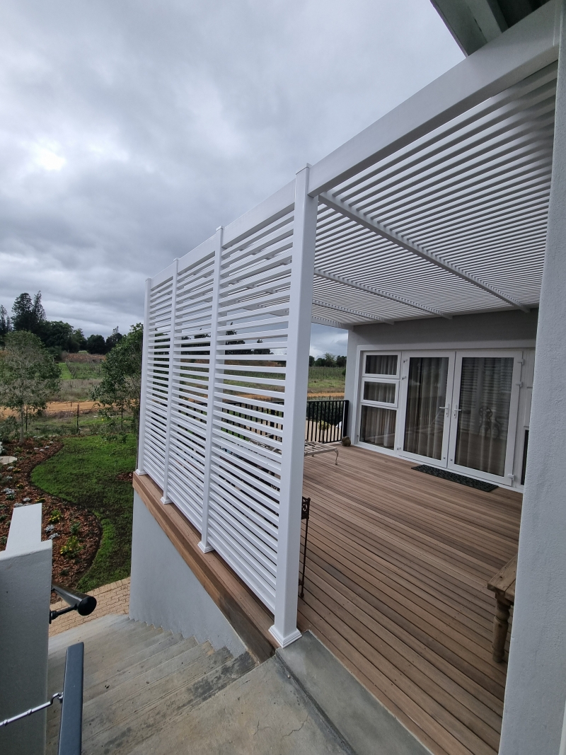 A real Groot Parys Lifestyle Estate outdoor deck went from exposed and unfinished to shaded, private and architecturally complete with a custom PVC modern slatted pergola by Value Fencing.